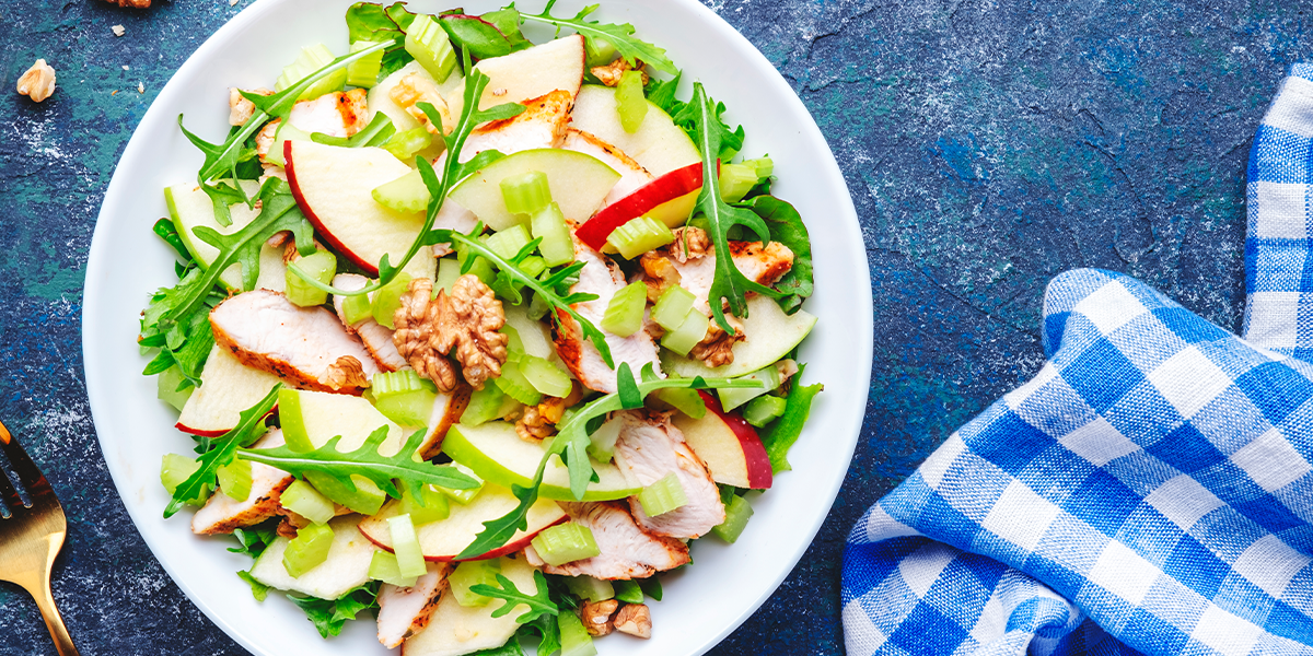 Süsd vagy főzd meg a húst úgy, ahogyan szeretitek és szoktátok, vagy csak sóval. Hagyd kihűlni és vágd kockákra. Hámozd meg az almákat, darabold fel, és vágd ugyancsak kis kockákra. A zellert is tisztítsd meg, vágd apró kockára, vagy le is reszelheted. Egy nagy tálban keverd össze a hús- és almakockákat, zellert és a kis darabokra tört dióbelet.